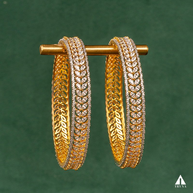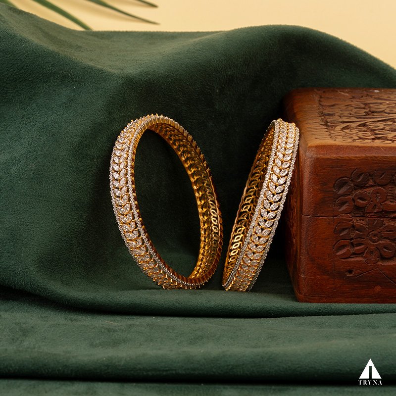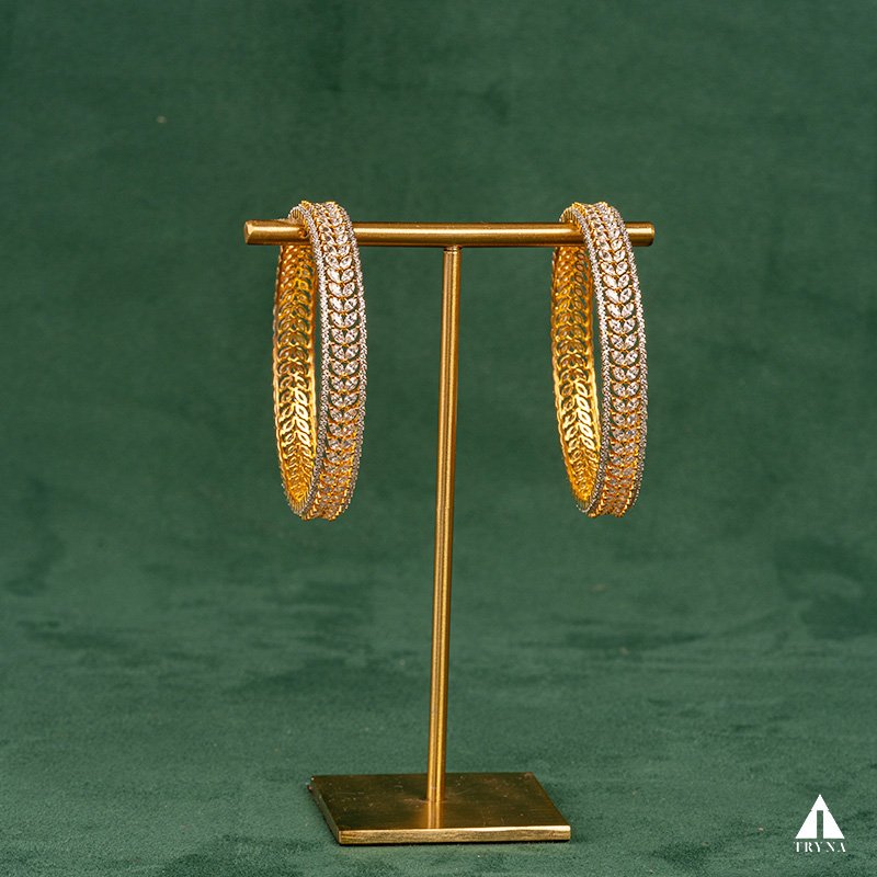 A sleek yet dazzling gold-plated bangle studded with sparkling CZ stones. It radiates sophistication and luxury, making your hands stand out beautifully during special occasions.