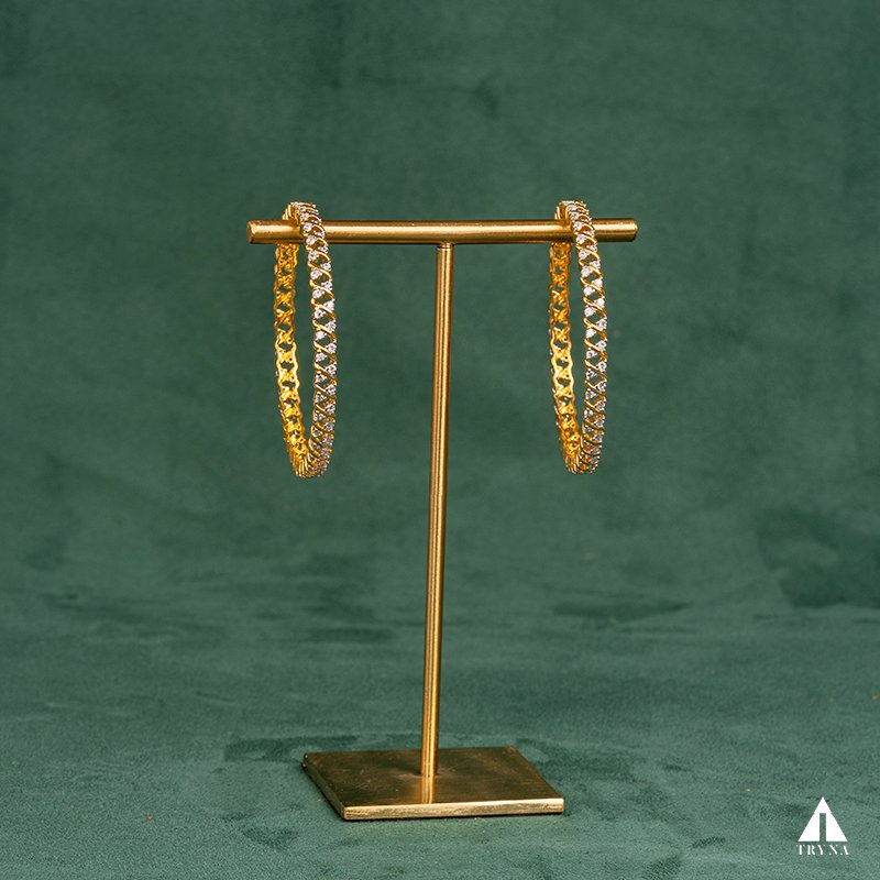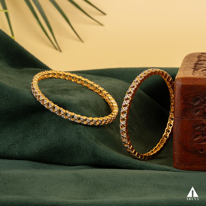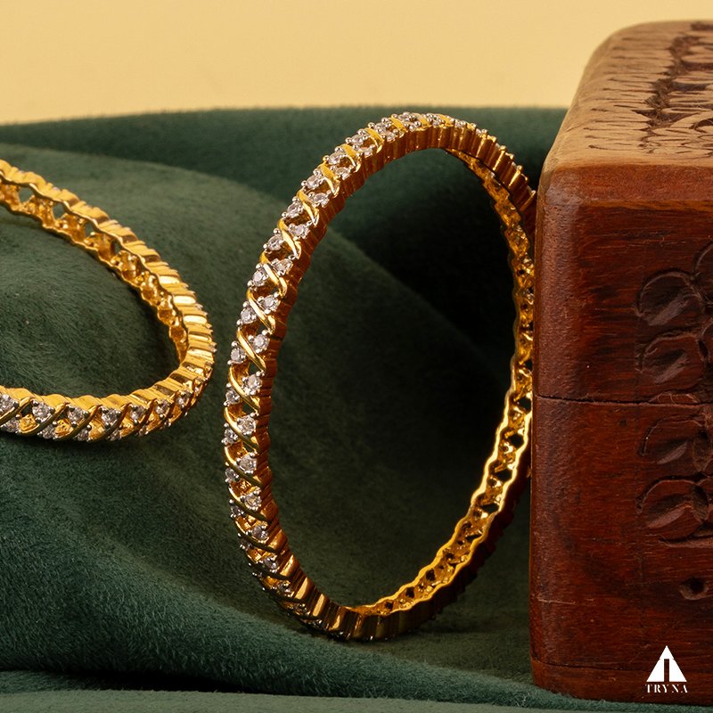 A sleek yet dazzling gold-plated bangle studded with sparkling CZ stones. It radiates sophistication and luxury, making your hands stand out beautifully during special occasions.