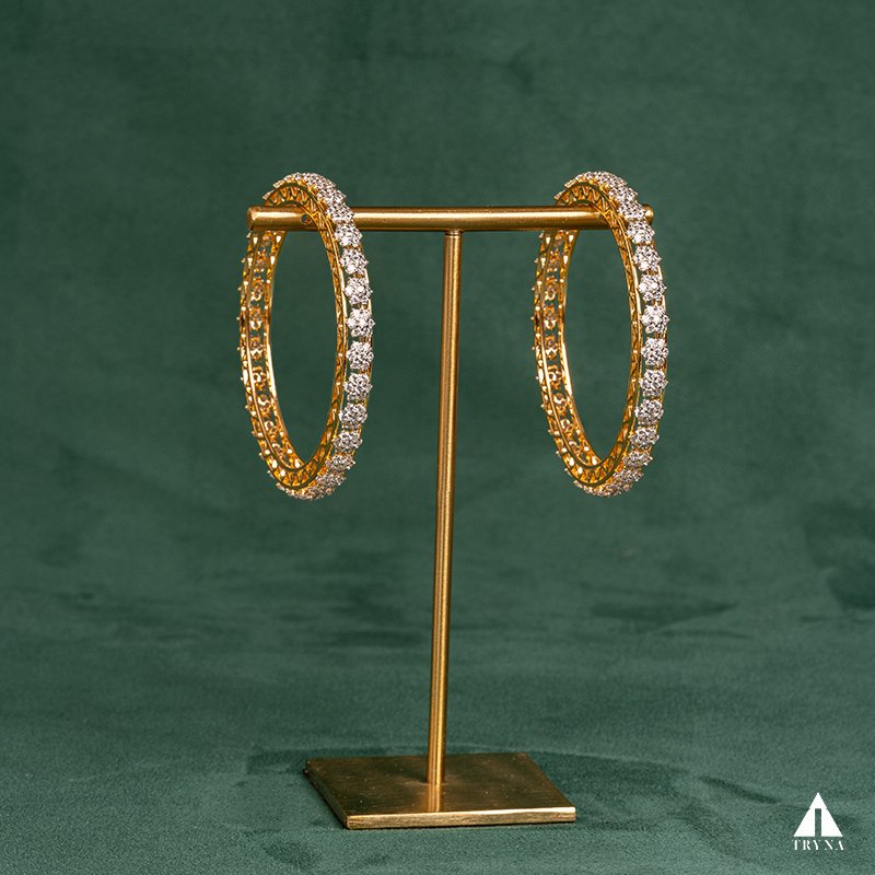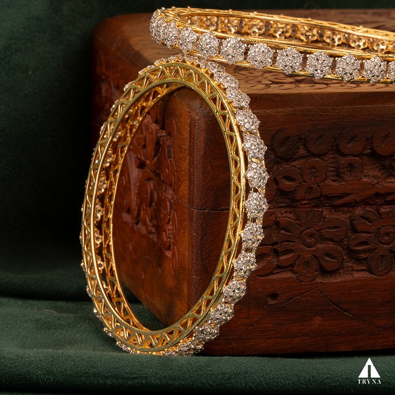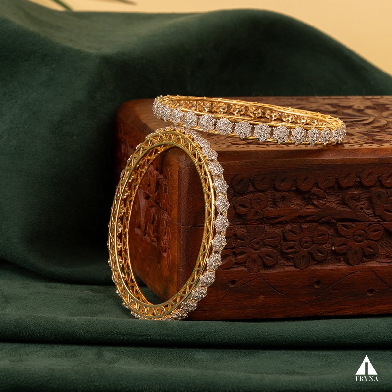 A sleek yet dazzling gold-plated bangle studded with sparkling CZ stones. It radiates sophistication and luxury, making your hands stand out beautifully during special occasions.
