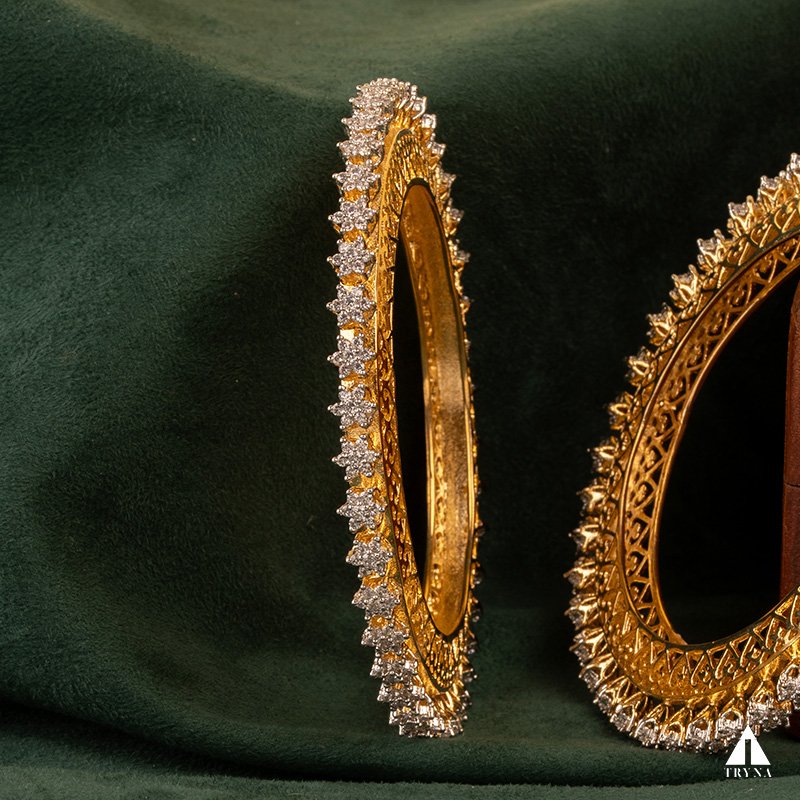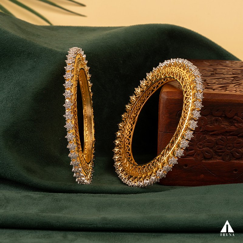 A sleek yet dazzling gold-plated bangle studded with sparkling CZ stones. It radiates sophistication and luxury, making your hands stand out beautifully during special occasions.