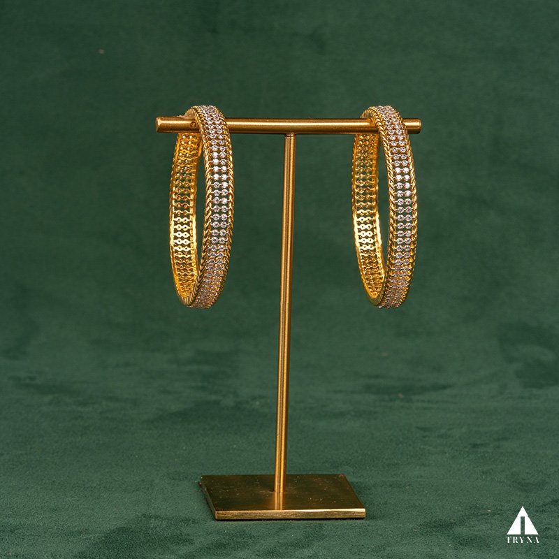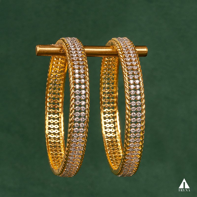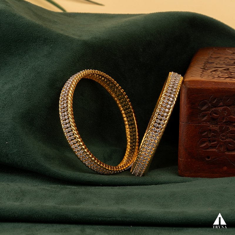 A sleek yet dazzling gold-plated bangle studded with sparkling CZ stones. It radiates sophistication and luxury, making your hands stand out beautifully during special occasions.