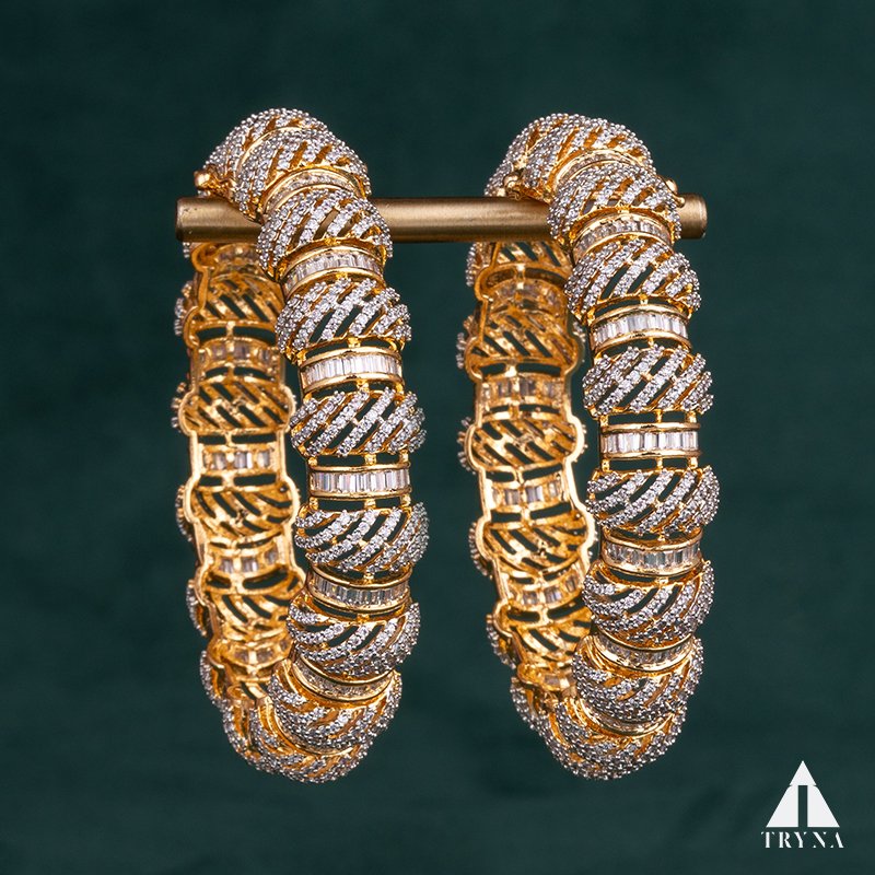 A sleek yet dazzling gold-plated bangle studded with sparkling CZ stones. It radiates sophistication and luxury, making your hands stand out beautifully during special occasions.