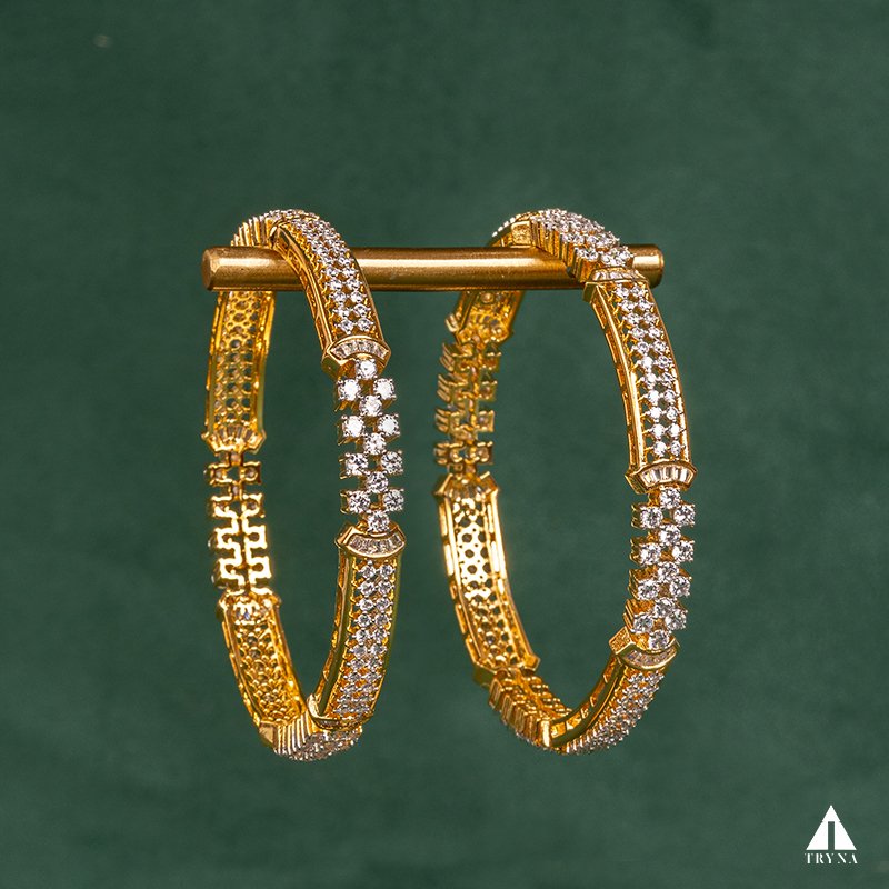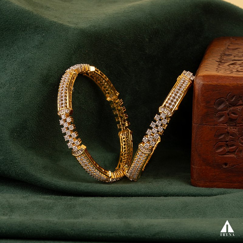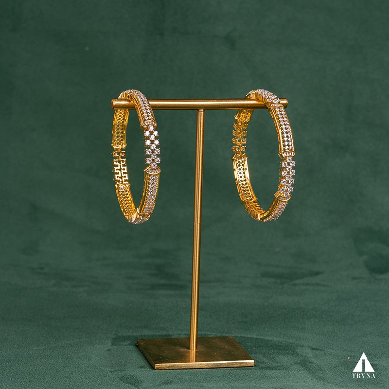 A sleek yet dazzling gold-plated bangle studded with sparkling CZ stones. It radiates sophistication and luxury, making your hands stand out beautifully during special occasions.