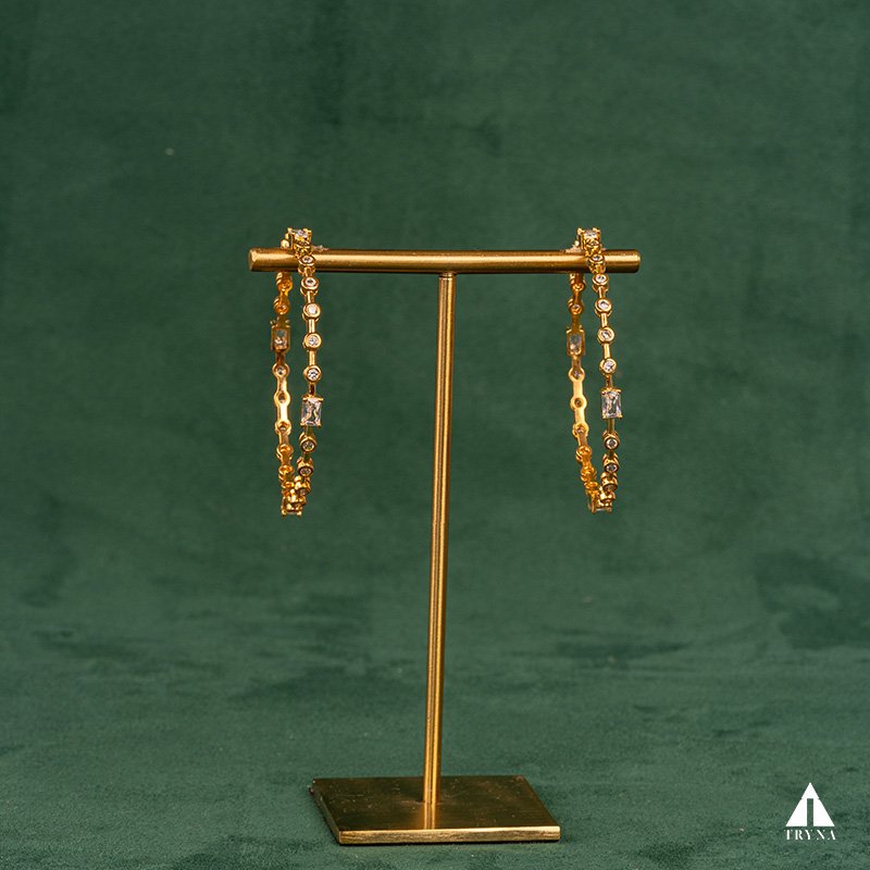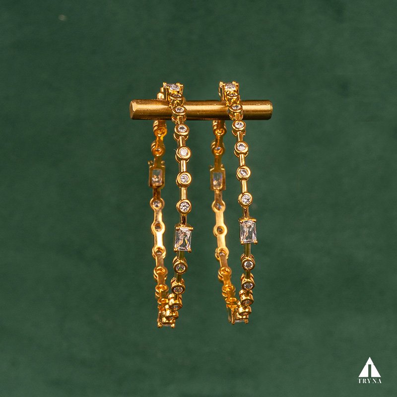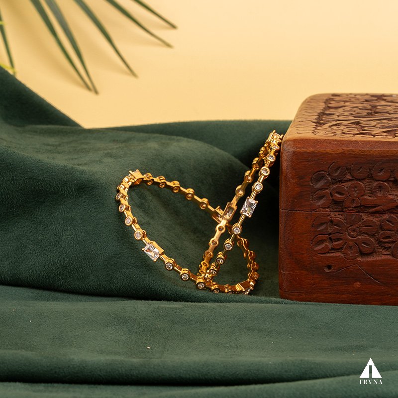 A sleek yet dazzling gold-plated bangle studded with sparkling CZ stones. It radiates sophistication and luxury, making your hands stand out beautifully during special occasions.